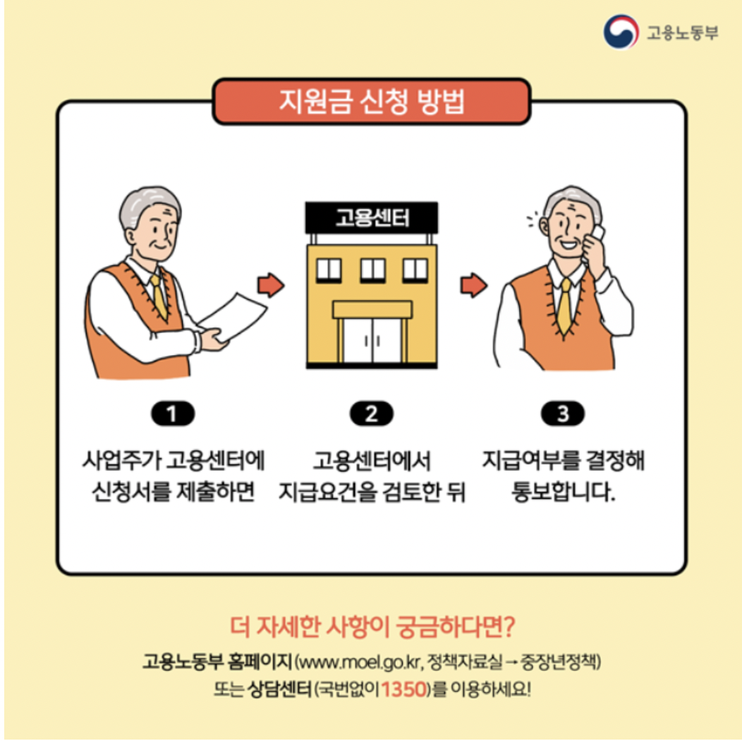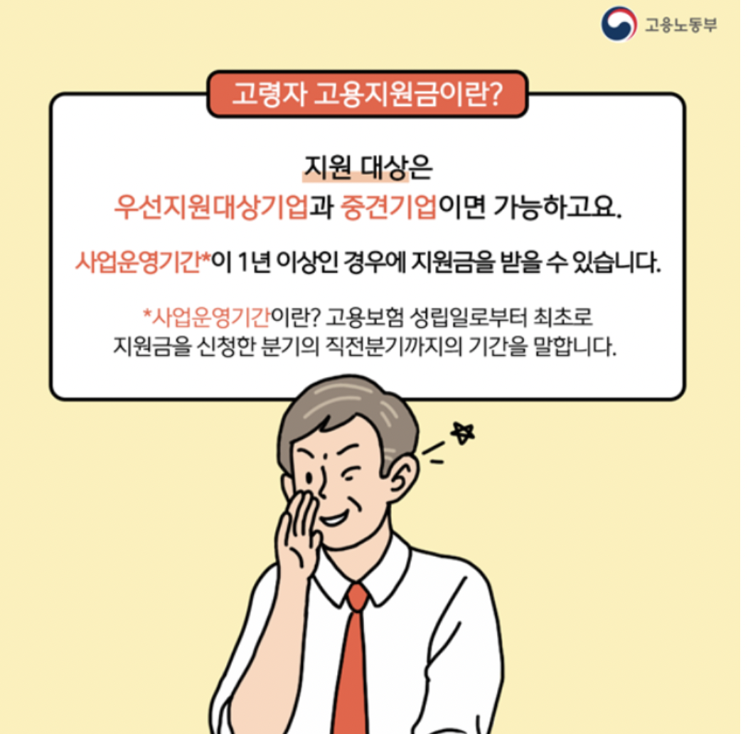 정년이 지난 60세 이상의 고령자의 고용안정 및 촉진을 위해, 60세 이상의 근로자를 고용한 우선 지원 대상 기업 및 중견기업에 지원금을 지급하는 사업이므로 아무 기업이나 신청이 가능한 것이 아니기 때문에 조건을 잘 확인해 보셔야 합니다 :)