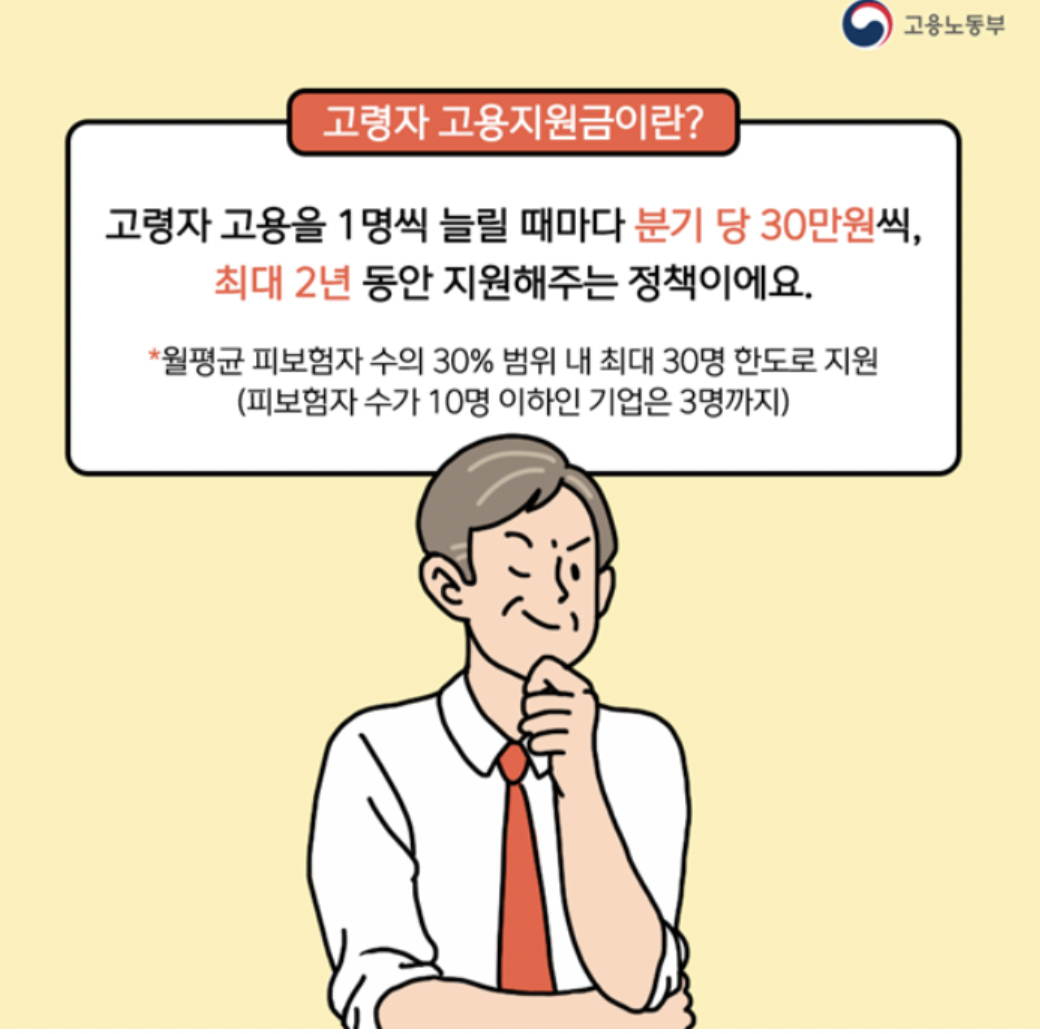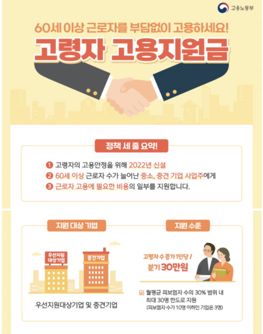 요즘 경기가 안 좋아지면서 젊은 사람, 고령자 상관없이 취업이 힘든 게 현실입니다. 그중에서도 더 취약한 계층이라고 할 수 있는 고령자들의 취업을 위해 나라에서 사업을 지원하고 있다는 것 혹시 알고 계셨나요? 혹시 모르셨다면 오늘! 고령자 고용지원금에 대해 자세하게 설명을 해드리겠습니다 ㅎㅎ 내년엔 꼭 취업 성공해 보자고요!
