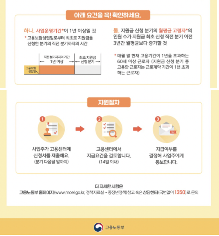 분기별 30만원이 큰돈이 아니라고 생각할 수 있지만 그냥 30만원이 아니고 1인 기준 30만원이니 꽤 많은 금액을 지원 받으 실수 있습니다. 그러므로 힘을 굉장히 많이 필요로 하지 않거나 고령자를 고용해도 괜찮은 일이라면 고령자를 고용하여 정부의 지원을 받아보시는 것도 좋을 것 같다는 생각이 듭니다 :)
