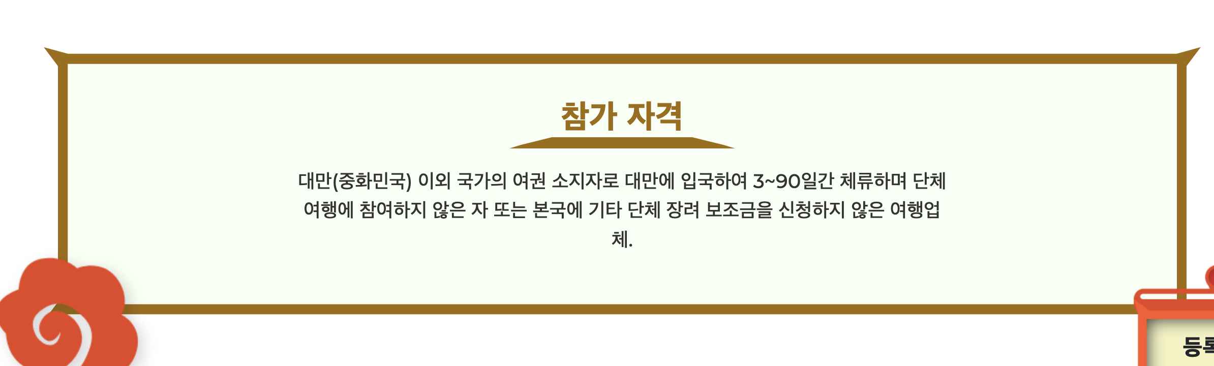 대만(중화민국) 외 국가의 여권 소지자로 대만에 입국하여 3~90일간 체류하며 단체 여행에 참여하지 않은 자 또는 본국에 기타 단체 장려 보조금을 신청하지 않은 여행 업체