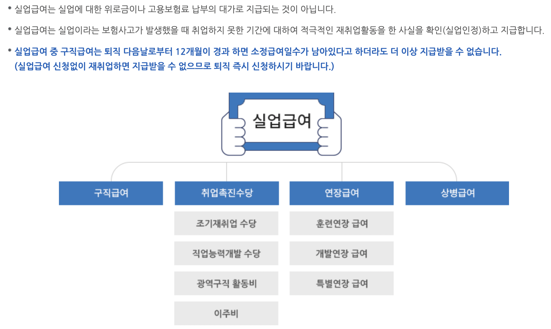 - 고용보험 가입 근로자가 실직 후 재취업 활동을 하는 기간에 소정의 급여를 지급하며 실업으로 인한 생계불안을 극복, 생활의 안정을 도와주고 재취업의 기회를 지원해 주는 제도로 우리에게 익숙한 실업급여는 구직급여라고 불립니다.