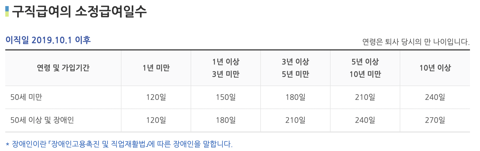 - 소정급여일수는 수급자격에 따라 실업급여를 지급받을 수 있는 날을 의미합니다. 고용보험 피보험기간 및 이직일 현재 근로자의 나이에 따라 소정급여일수는 다릅니다. 최소 120일에서 최대 270일까지 법적으로 정해져 있습니다.