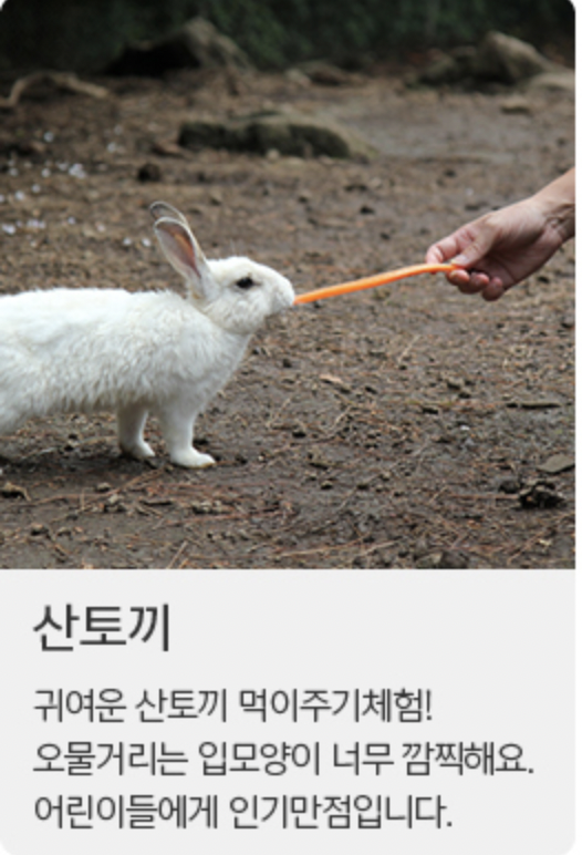 : 도심속 에서 보기 어려운 동물들을 가까이에서 만나보고, 먹이주기 체험을 통해 동물과 교감을 나눌 수 있습니다.