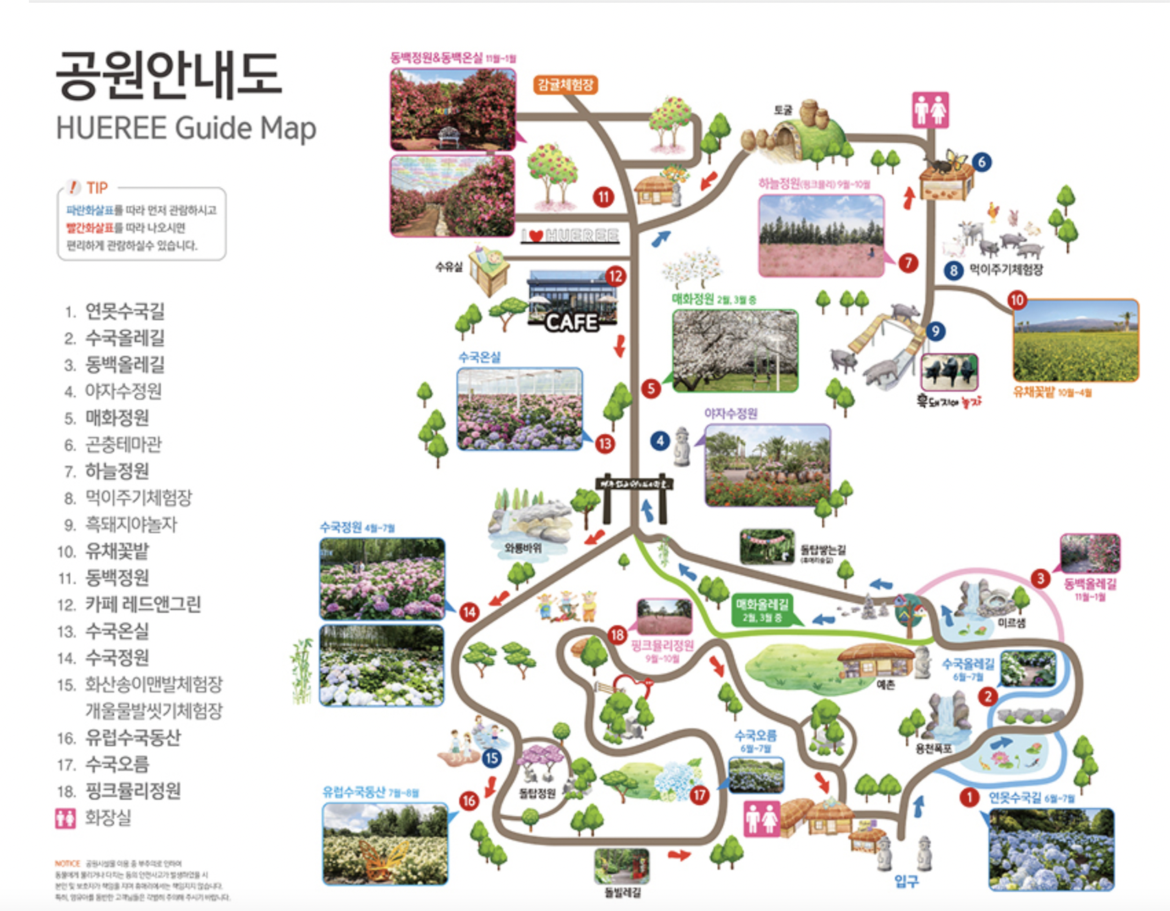 휴애리 수국축제를 알차게 보내기 위해선 내부 위치를 알아두시는 게 좋습니다! 특히 연못 수국 길, 수국 온실, 수국 정원, 수국 오름 그 외에도 아름다운 공간들이 많으니 공원 안내도를 참고해 주세요!